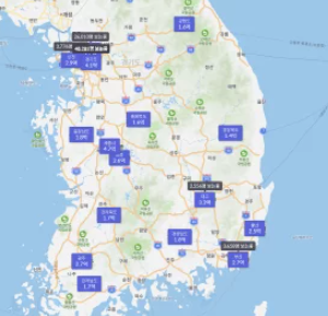 1: 30km까지 지도를 축소했을 경우 서울, 경기도, 부산, 대구, 광주, 인천, 전라남도, 전라북도, 경상북도, 경상남도, 강원도 등 각 행정구역별 평균 부동산 가격을 알 수 있습니다.