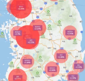 1: 30km까지 지도를 축소했을 경우 서울, 경기도, 부산, 대구, 광주, 인천, 전라남도, 전라북도, 경상북도, 경상남도, 강원도 등 각 행정구역별 평균 부동산 가격을 알 수 있습니다.